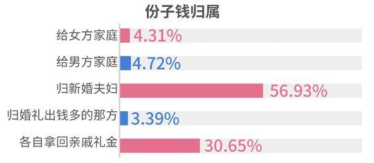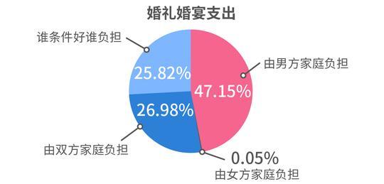 对于婚礼婚宴酒席的支出,47.15%的单身男女认为应该由男方家庭负担,26.98%认为应由双方家庭分开负担或新婚夫妇自行负担(25.83%),而不足一成的单身男女认为应由女方家庭负担。而对于婚礼份子钱的归属,56.93%的人认为应当归新婚夫妇,30.65%的人则认为该各自拿回亲戚礼金。