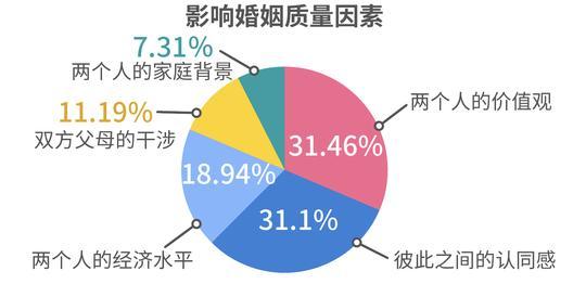 影响婚姻质量最重要的因素为两个人的价值观和彼此之间的认同感。其他依次为两个人的经济水平、双方父母的干涉、两个人的家庭背景等。