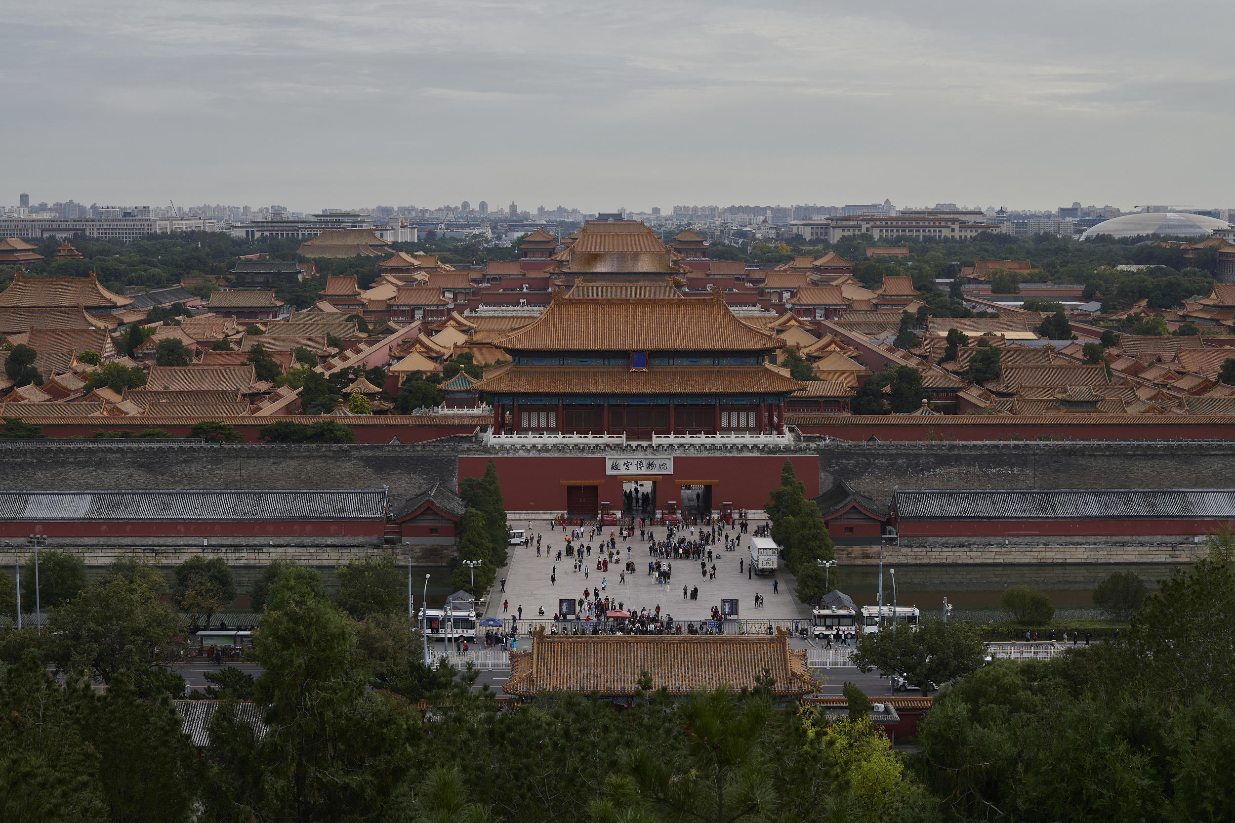 故宫位于天安门北端,旧称紫禁城,始建于明永乐五年(1407年),建成于明永乐十八年(1420年),占地面积约78万平方米。故宫南北长961米,东西宽753米,四面围有高10米的城墙,城外有宽52米的护城河,真可谓有金城汤池之固。故宫有四座城门,南面为午门,北面为神武门,东面为东华门,西面为西华门。城墙的四角,各有一座风姿绰约的角楼,民间有九梁十八柱七十二条脊之说,形容其结构的复杂。紫禁城内的建筑分为外朝和内廷两部分。外朝的中心为太和殿、中和殿、保和殿,统称三大殿,是国家举行大典礼的地方。三大殿左右两翼辅以文华殿、武英殿两组建筑。内廷的中心是乾清宫、交泰殿、坤宁宫,统称后三宫,是皇帝和皇后居住的正宫。其后为御花园。后三宫两侧排列着东、西六宫,是后妃们居住休息的地方。东六宫东侧是天穹宝殿等佛堂建筑,西六宫西侧是中正殿等佛堂建筑。外朝、内廷之外还有外东路、外西路两部分建筑。