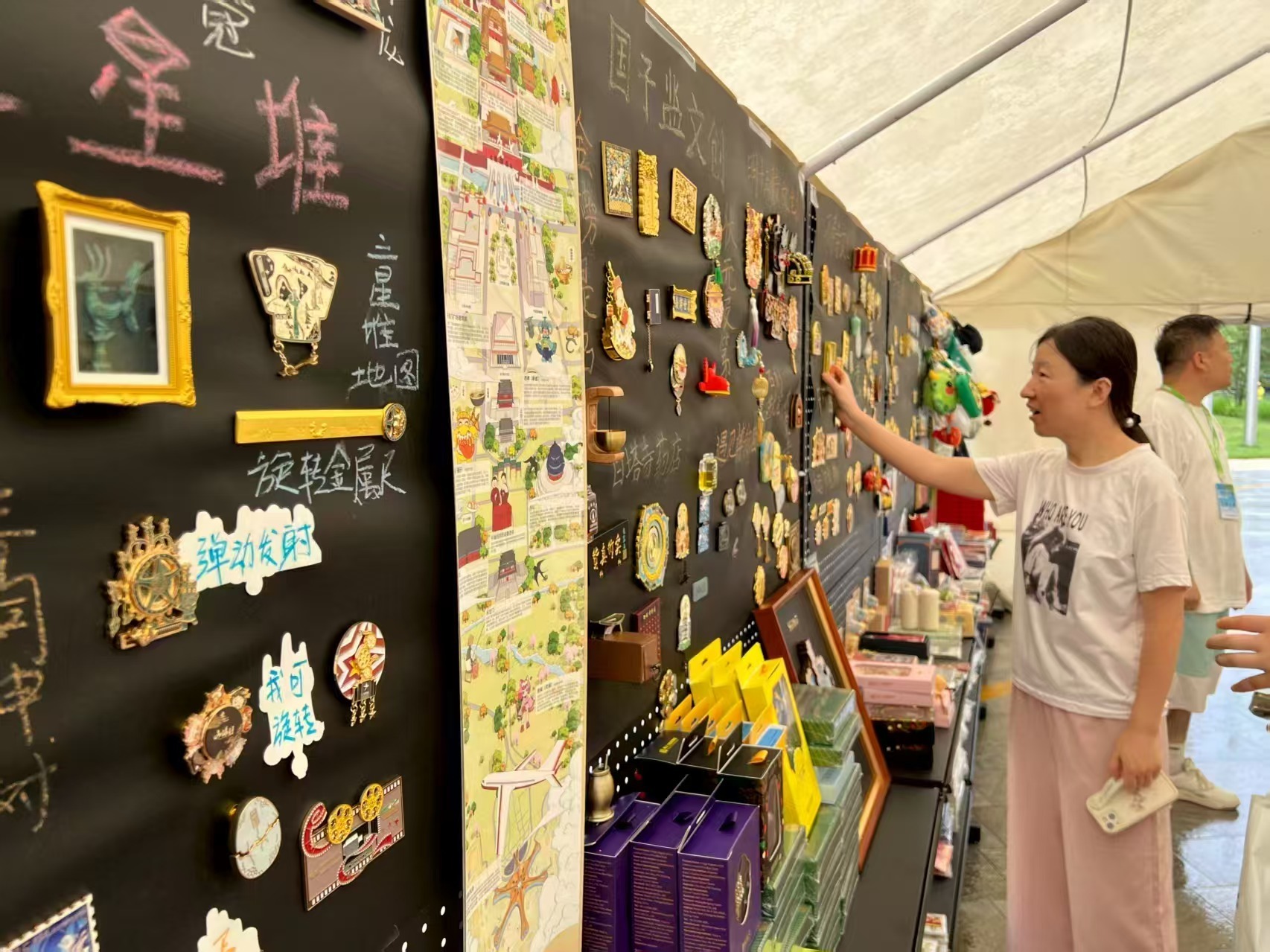 开市以来,主办方通过设立博物馆文创、公园景区文创、图书周边文创和非遗手作文创等专区,甄选特色文博文创产品,并不断在展陈策划方面创意创新。以“哈利·波特”等热门IP产品,实现古今中外文化元素的汇聚展示。以朝代为轴线,用冰箱贴上的珍贵文物串联起华夏历史,成为游客争相打卡拍照的网红背景板。在北京中轴线申遗成功一周年之际,市集集合图书、文创、艺术品等,以中轴线文化遗产点为主线,专门更新搭建展台和布置文创产品专区,让更多京内外游客了解和体验北京中轴线文化魅力。在第三周为市集引入北京工美集团,为其六大系列产品搭建单独展篷,并结合市民游客消费特点优化其产品选型和展陈布置,让市民游客近距离接触到传统技艺和工美精品。据统计,本次市集累计引入30余家头部文创品牌,1000余款精选文创和2000余种精品图书,主题展累计引入近百家非遗文化企业或工作室,餐饮摊位入驻商户超过20家。
