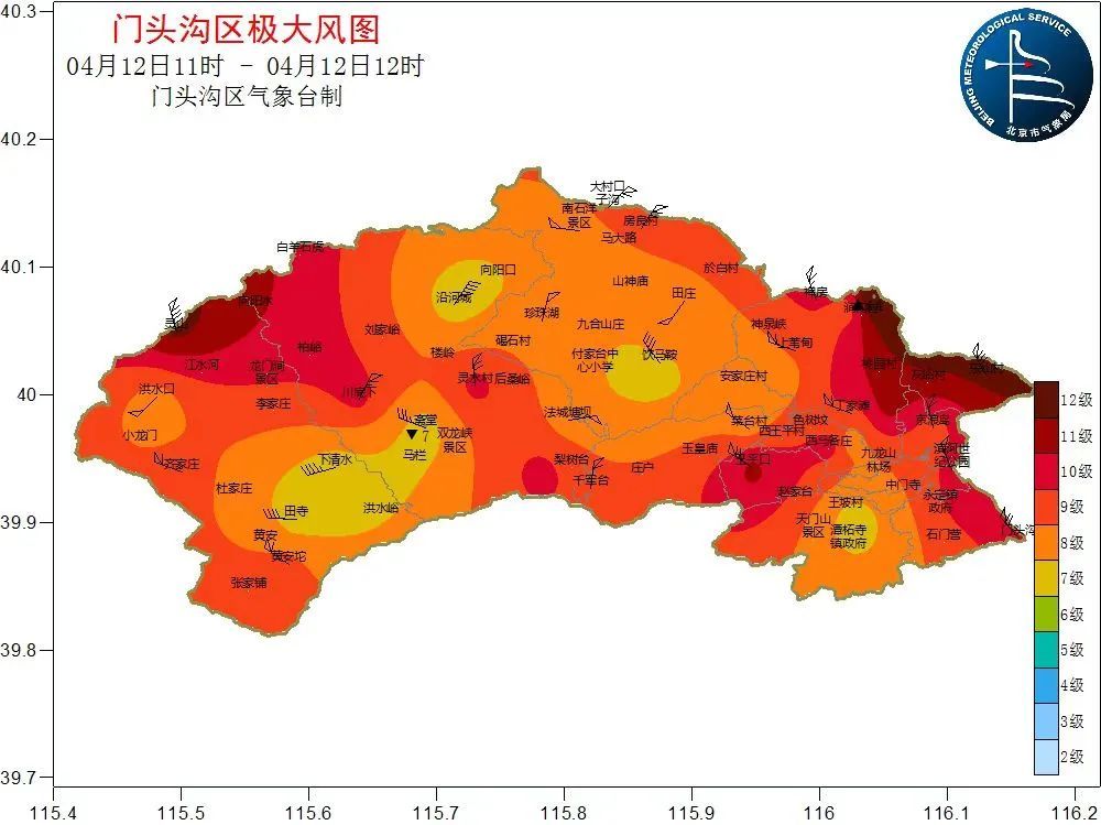 4月12日凌晨,位于北京门头沟高山玫瑰园测站的风速仪跳出了45.2米/秒,中午11时,全市大风极值42.2米/秒再出现这里,这是北京自1951年有气象记录以来,4月最强的一次极端大风天气,达到陆地瞬时14级阵风水平。