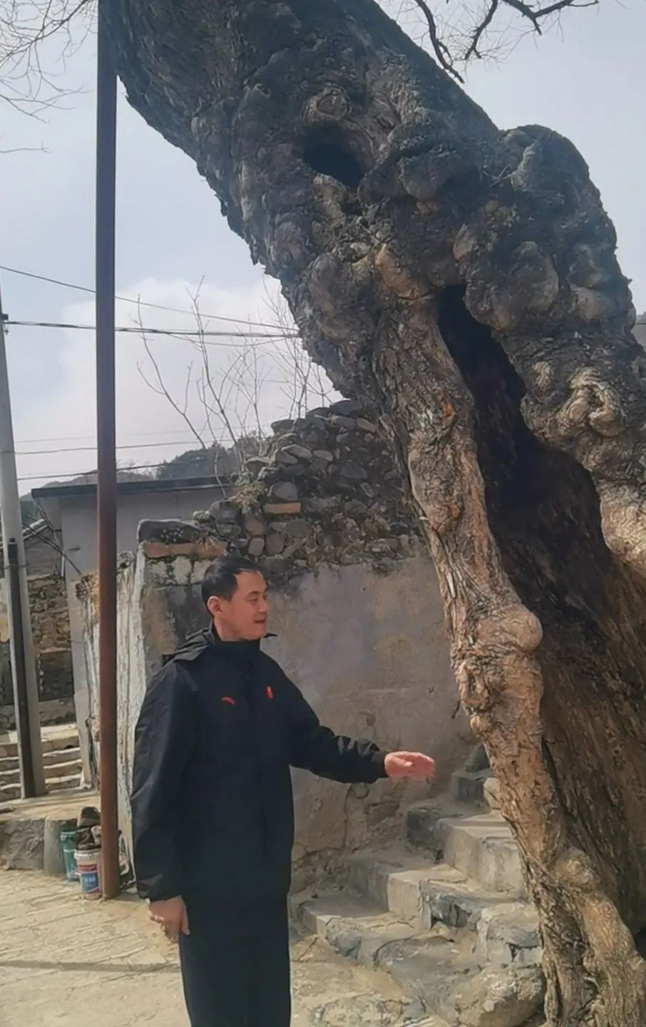禁止携带火种进山的标识,隔不远就能看到。涧沟村口一株300多年的古树,被岁月掏空了树干,但是依然挺立。驻村应急的妙峰山镇副镇长杜德松说:“大树附近的架空线我们也在实时监控,11日晚间风起后,我们在20时40分巡查村里的古树完好,最后又一遍巡查林区入口,虽然辛苦,但是一切安然。”