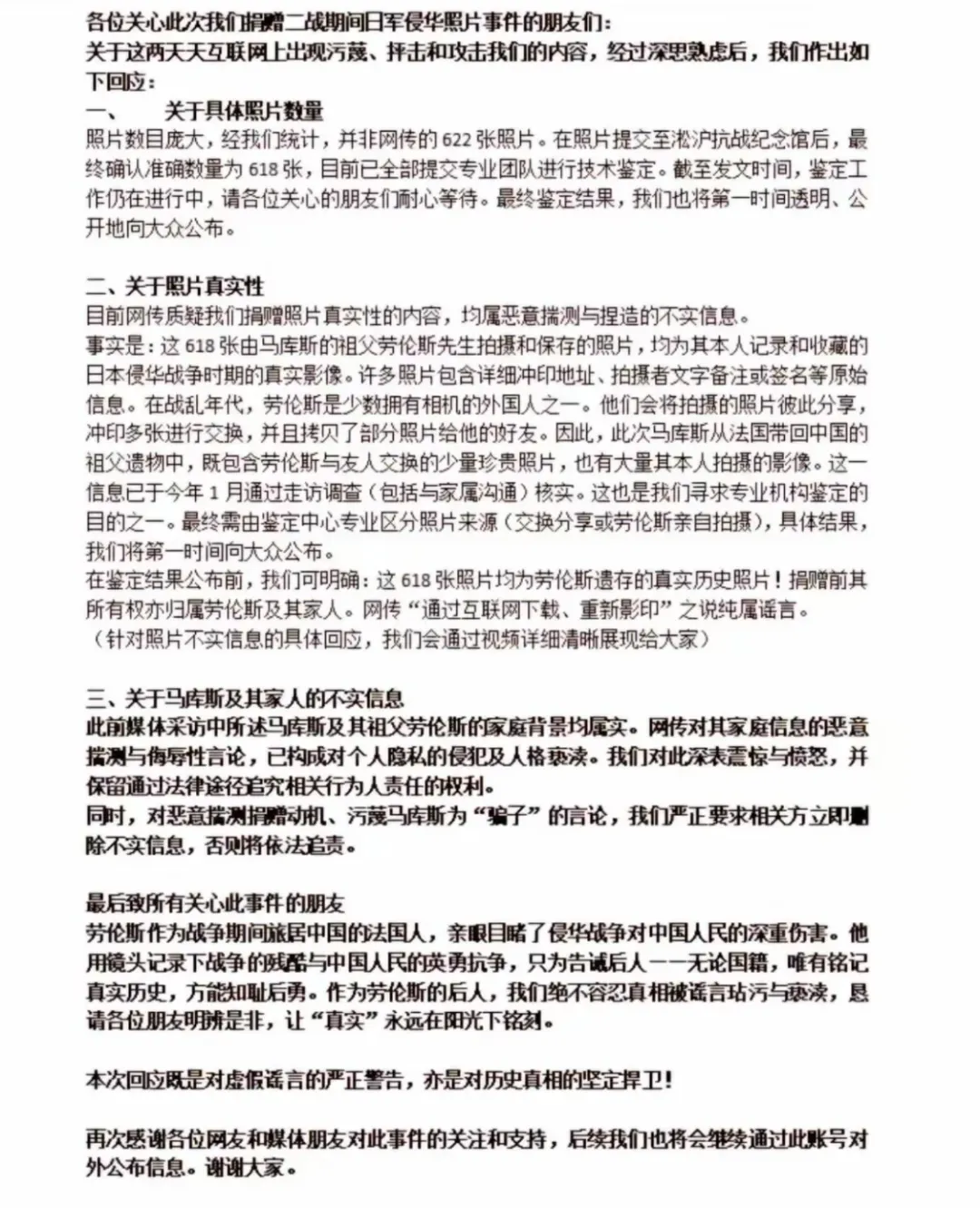2月28日,马库斯方账号“松杰的朋友们”发布视频回应疑问,“提交给纪念馆的都是劳伦斯(马库斯外祖父)遗留下来的照片原件,并不是网上下载打印的照片。”