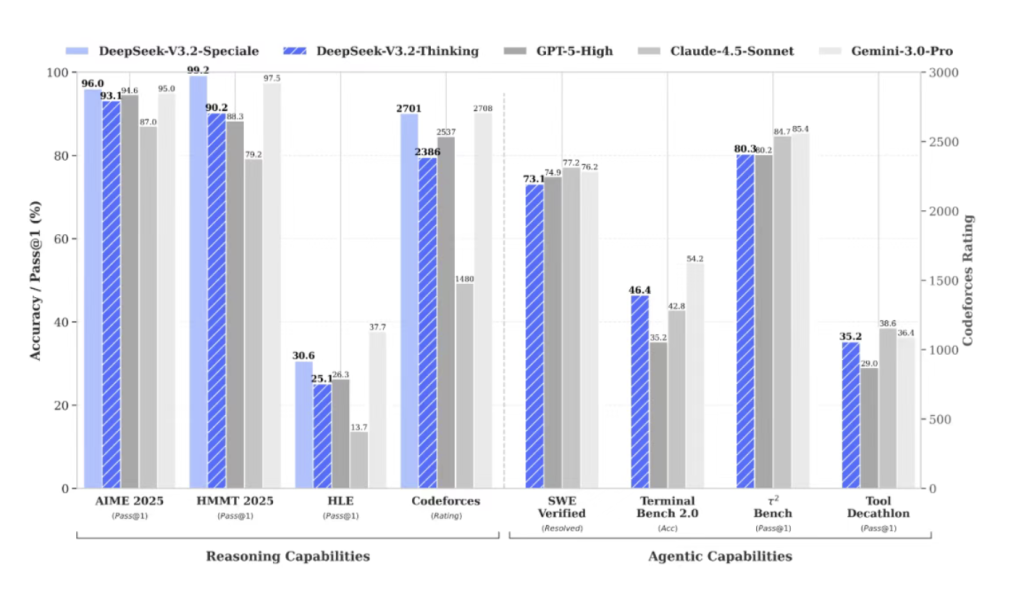 DeepSeek-V3.2具备指令跟随、数学证明与逻辑验证能力,在主流推理基准测试上的性能表现媲美Gemini-3.0-Pro。