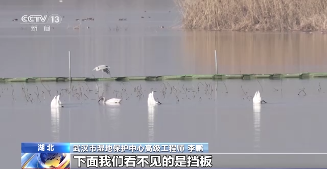 武汉市湿地保护中心高级工程师 李鹏:上面我们看到的是类似于网的网状材料,它是为了防止鱼进来取食下面的植物的嫩叶或者根茎。下面我们看不见的是挡板,在先期为了让它更快地形成生态群落,隔绝它与外围的水的流动。