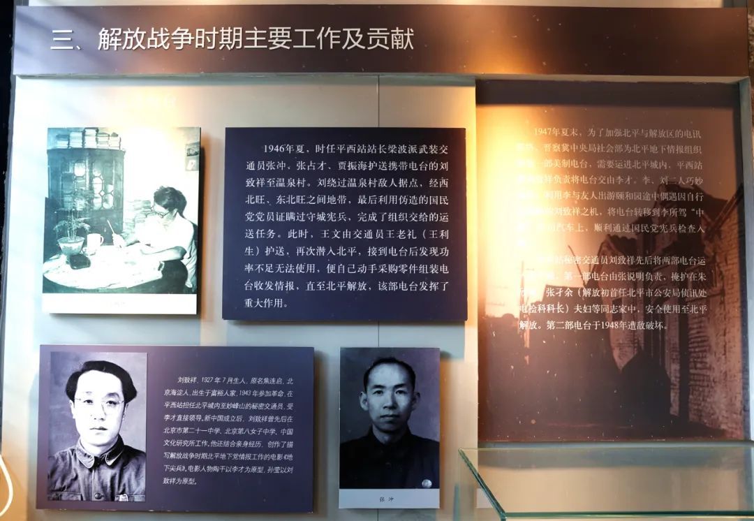 纪念馆是一个古朴的四合院,还原了平西情报联络站的工作场所,一张张照片、一段段文字、一件件实物,无不诉说着隐蔽战线的革命事迹。