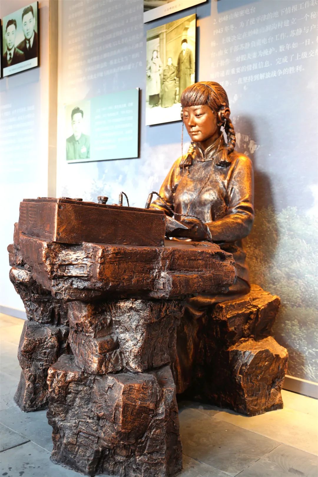 纪念馆里,有一个正坐在石桌旁操作电台的雕塑,这个雕塑的原型名叫苏静,1943年她被委派到这里负责新建电台的工作,为绝对保密,她与房东的儿子假扮夫妻,平日正常劳作,晚上住在狭小的山洞里秘密发报,这一干就是六年,从抗战一直持续到解放战争取得胜利。