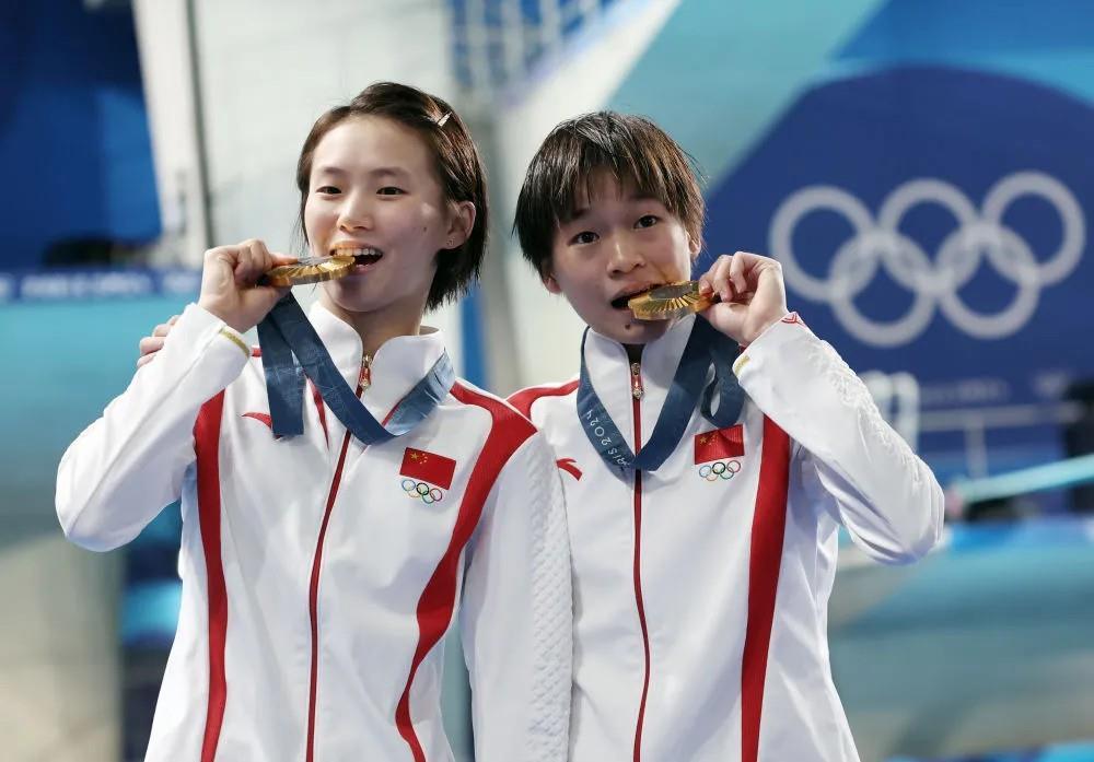 7月31日,冠军中国选手陈芋汐(左)/全红婵在颁奖仪式上。