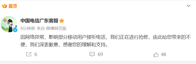 中国电信回应广东无信号:正在抢修,深表歉意。