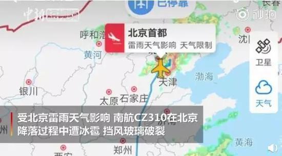 5月26日上午,受北京雷雨天气影响,南航CZ3101广州-北京航班在降落过程中,飞机遭冰雹袭击,挡风玻璃破裂。机组按手册程序处置,飞机已于上午11:48分安全降落北京首都机场,机上人员平安。