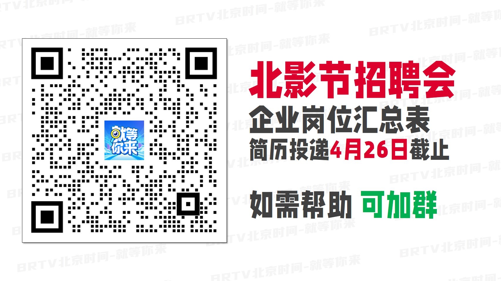 与此同时,北影节招聘会的线上专场也已同步开启。求职者可在北京时间客户端“就等你来”专区获取用人单位提供的简历投递方式,自行联系企业投递简历。用人单位完成简历筛选后,会与候选人联系安排后续面试。简历投递4月26日截止,所有岗位招满即止。>>>点我查看用企业岗位汇总表