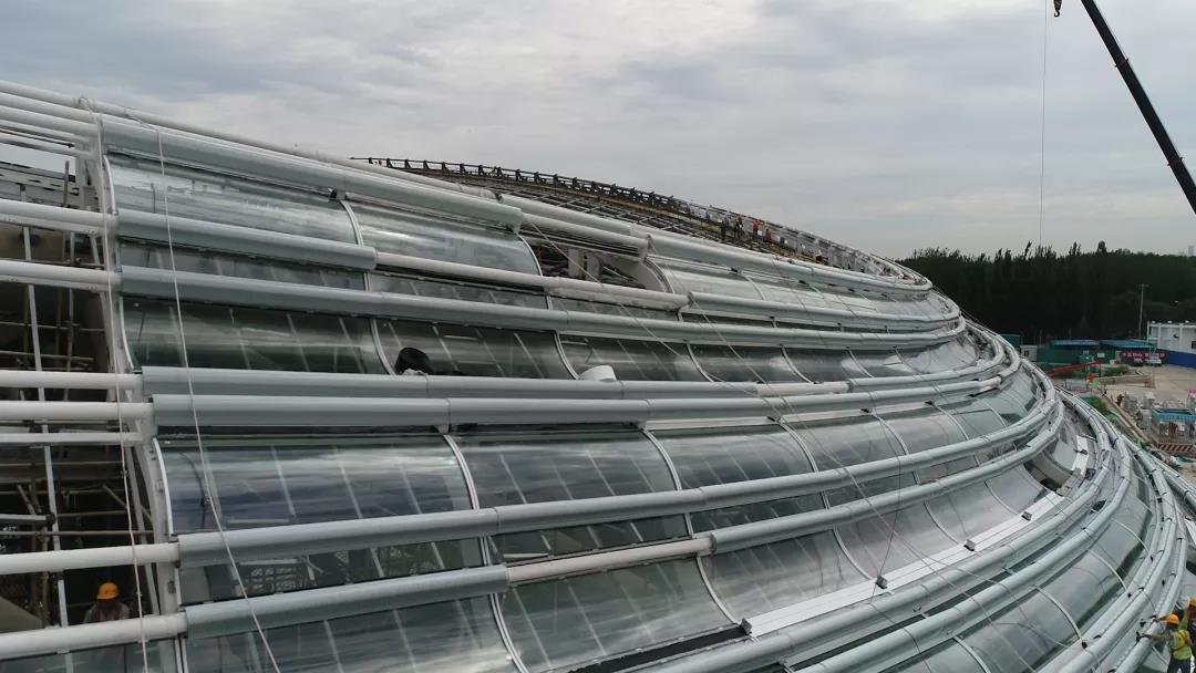 玻璃幕墙的安装是目前国家速滑馆建设的重要工作之一,这就好像是给建筑穿上“衣服”。其中非常巧妙的是:幕墙用玻璃经过建筑师的几何逻辑优化,不论是向内曲面还是向外曲面,都采用了同一曲率半径,这就非常有效地降低了玻璃幕墙制造以及安装的难度。