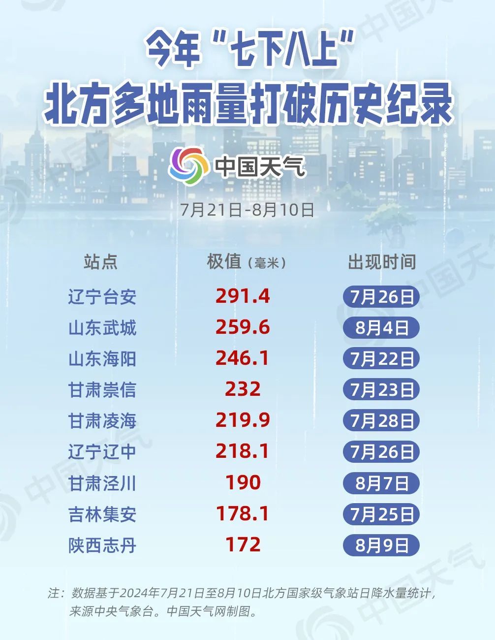 眼下,我国北方“七下八上”降雨集中期接近尾声。今年“七下八上”期间(7月21日至8月10日),北方平均降雨量较常年偏多,共经历了5轮强降雨过程,多地日雨量打破历史同期纪录。今年“七下八上”哪里的雨最猛?未来北方还有强降雨吗?为您一一解读。