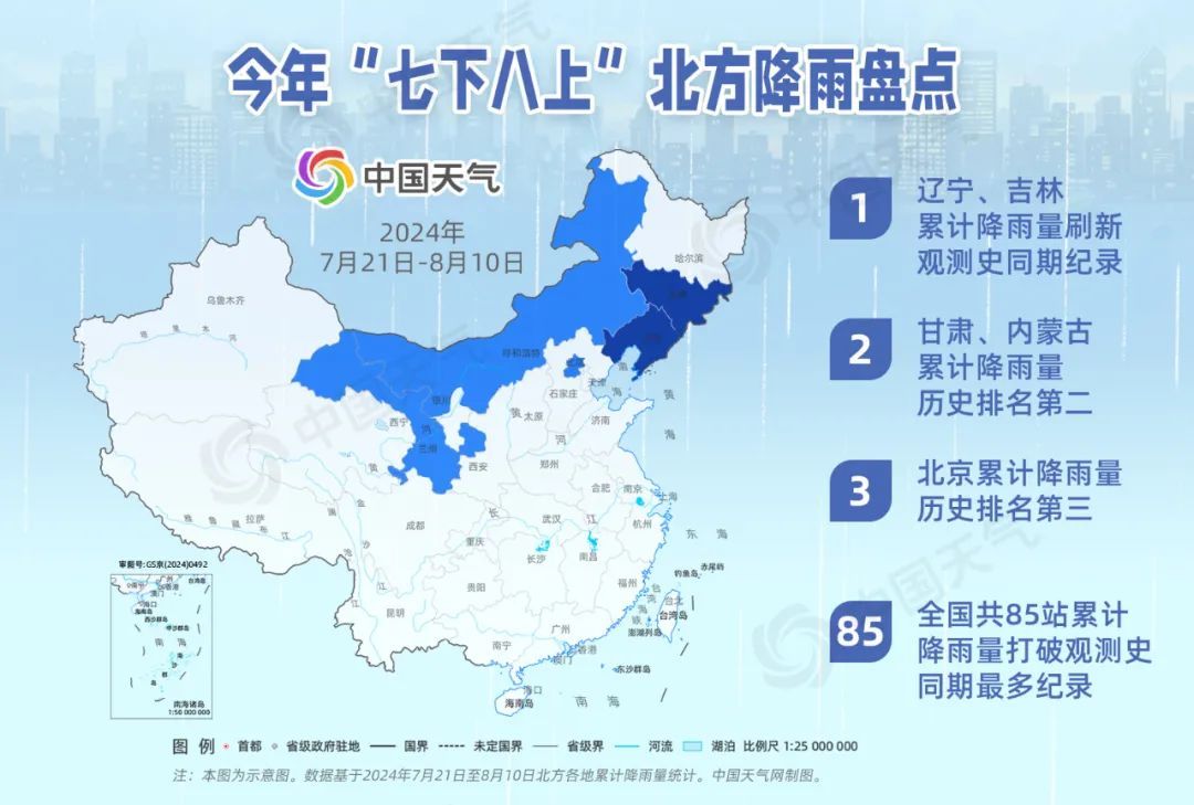 “今年7月21日至8月10日期间,我国北方平均降雨量较常年同期偏多,一共出现了5轮强降雨天气过程。”中国天气网气象分析师叶梦龙介绍。其中,辽宁、吉林累计降雨量刷新历史同期纪录,甘肃、内蒙古历史第二,北京历史第三。