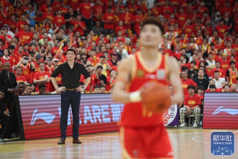 ↑浙江方兴渡队主教练王博在场边观看队员孙铭徽罚球。新华社记者 雒圆 摄