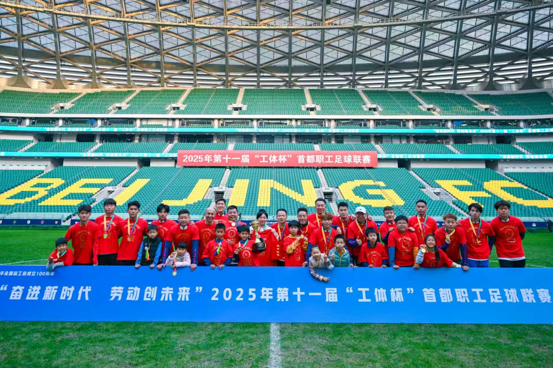 2025年第十一届“工体杯”首都职工足球联赛近日在北京工人体育场落下帷幕。经过两个多月的激烈角逐,冠军最终由朝阳区总工会代表队获得,西城区总工会代表队与北京市服务工会代表队分获亚军、季军。北京市服务工会代表队队员张兆辉获评“最佳射手”,朝阳区总工会代表队队员苗宇获评“最佳门将”。全国总工会宣教部、北京市总工会、北京市体育局有关负责人现场观看决赛并为获奖球队和队员颁奖。