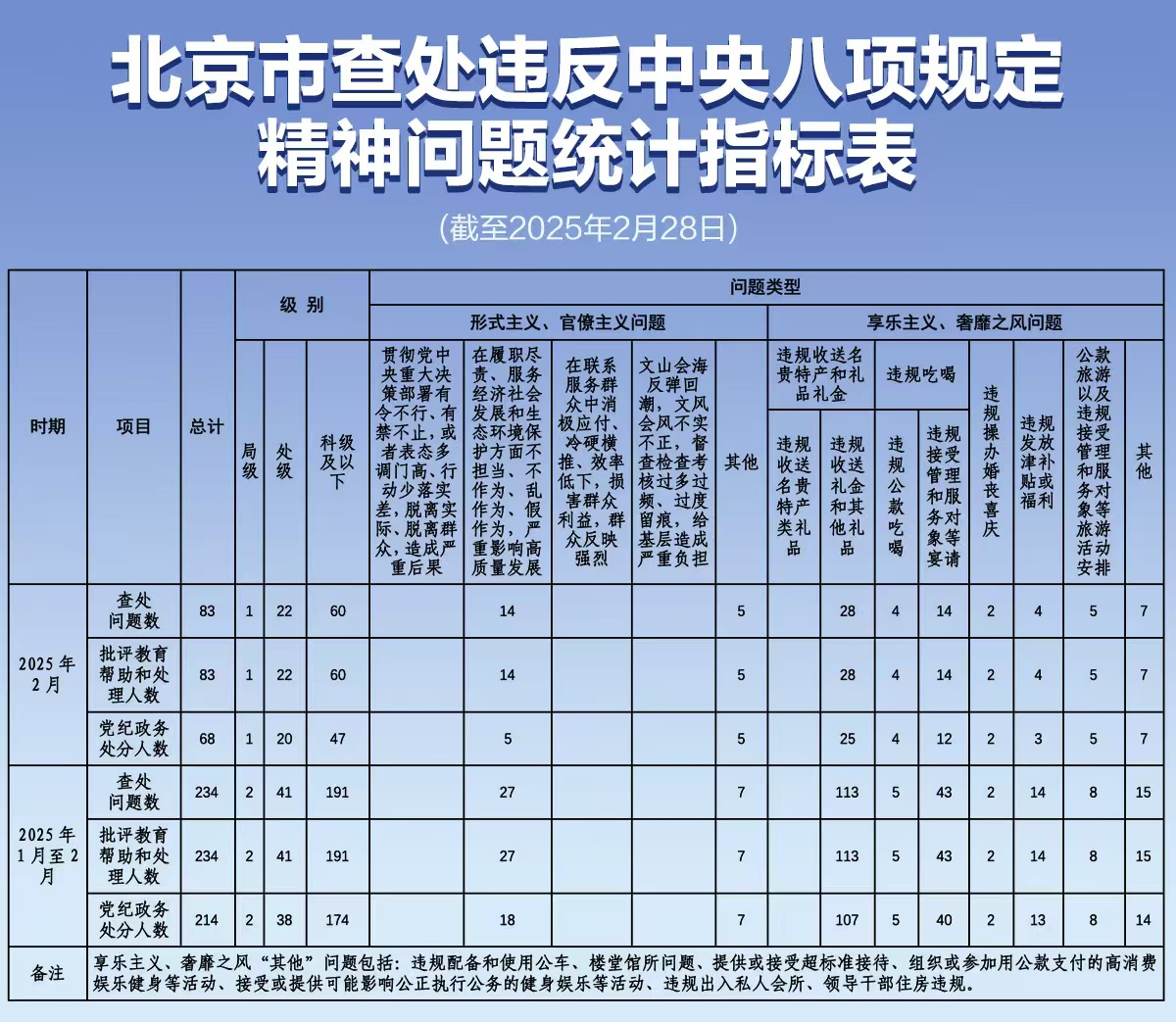 日前,市纪委监委公布今年1月至2月查处违反中央八项规定精神问题统计指标表。截至2月28日,本市累计查处违反中央八项规定精神问题234起,批评教育帮助和处理234人,其中局级2人、处级41人、科级及以下191人。