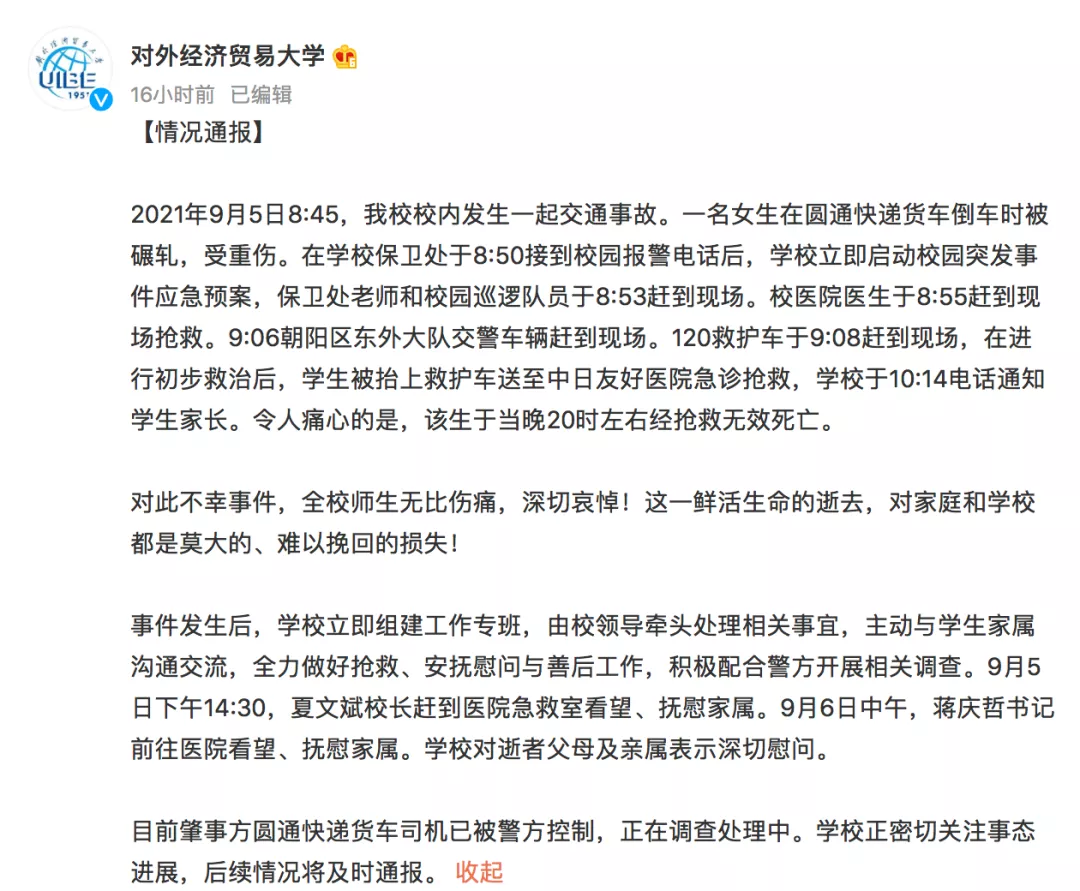 9月6日,对外经济贸易大学通报该事件。通报称,2021年9月5日8:45,该校校内发生一起交通事故,一女生被圆通快递货车倒车时碾轧,造成重伤。