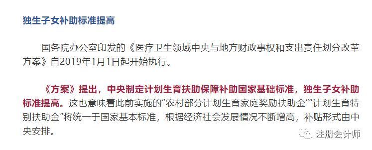 前几天,人民日报发文表示独生子女补助标准提高:查阅了相关的文件,原来是国务院在去年8月份印发了《关于印发医疗卫生领域中央与地方财政事权和支出责任划分改革方案的通知》,其中,方案指出中央制定计划生育扶助保障补助国家基础标准,并根据经济社会发展情况逐步提高。中央财政参照上述基本公共卫生服务支出责任中央分档分担办法安排补助资金。