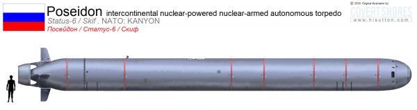 " 波塞冬"核鱼雷是俄罗斯一种新型战略武器,该系统采用核动力推进,航程几乎无限,可以从俄罗斯近海直接向美国本土实施核反击,该系统据称采用200万吨或者更大当量的核弹头,在沿海实施水中爆炸,通过放射性海啸和辐射落尘来攻击沿海经济地区。这被认为是俄罗斯的一种"末日武器",用来确保美国无法取得核战争的胜利。