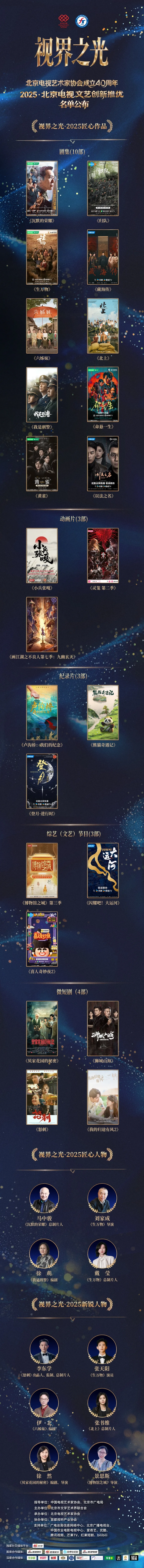 活动现场“视界之光·2025北京电视文艺创新推优”结果揭晓,覆盖电视艺术的各个领域,包括剧集、纪录片、动画片、综艺(文艺)节目、微短剧,共有23部作品获得“视界之光·2025匠心作品”,4人入选“视界之光·2025匠心人物”,6人入选“视界之光·2025新锐人物”。