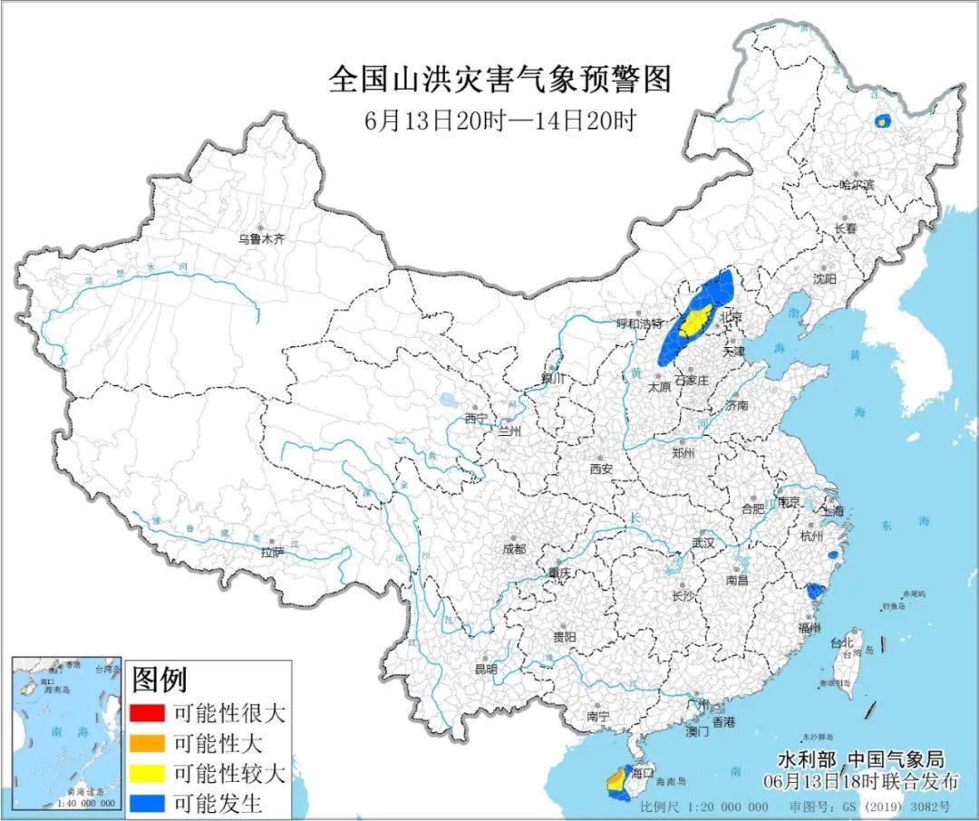 预计,6月13日20时至6月14日20时,北京西部、河北中部、山西东北部、黑龙江中部、海南西部等地部分地区发生山洪灾害可能性较大(黄色预警),其中,海南西北部局地发生山洪灾害可能性大(橙色预警),预警区域涉及的县(市、区)见下表。其他地区也可能因局地短历时强降水引发山洪灾害,请各地注意做好实时监测、防汛预警和转移避险等防范工作。