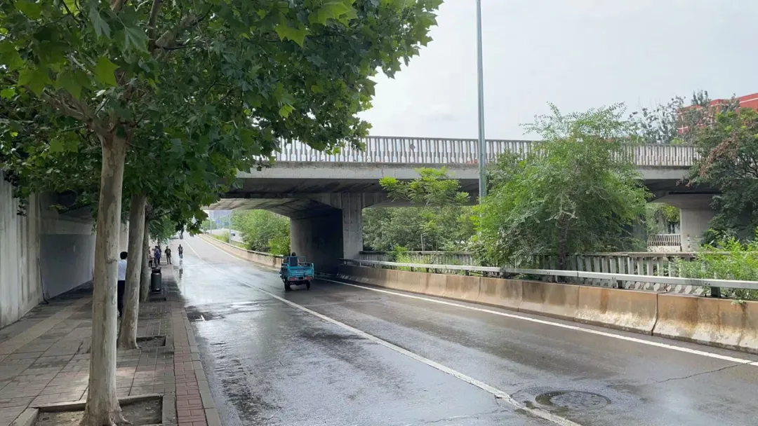 北京广播电视台的记者实地探访了汽车涉水路段,旱河路北向南方向,京粮广场的西北侧,此处为下凹式铁路桥。