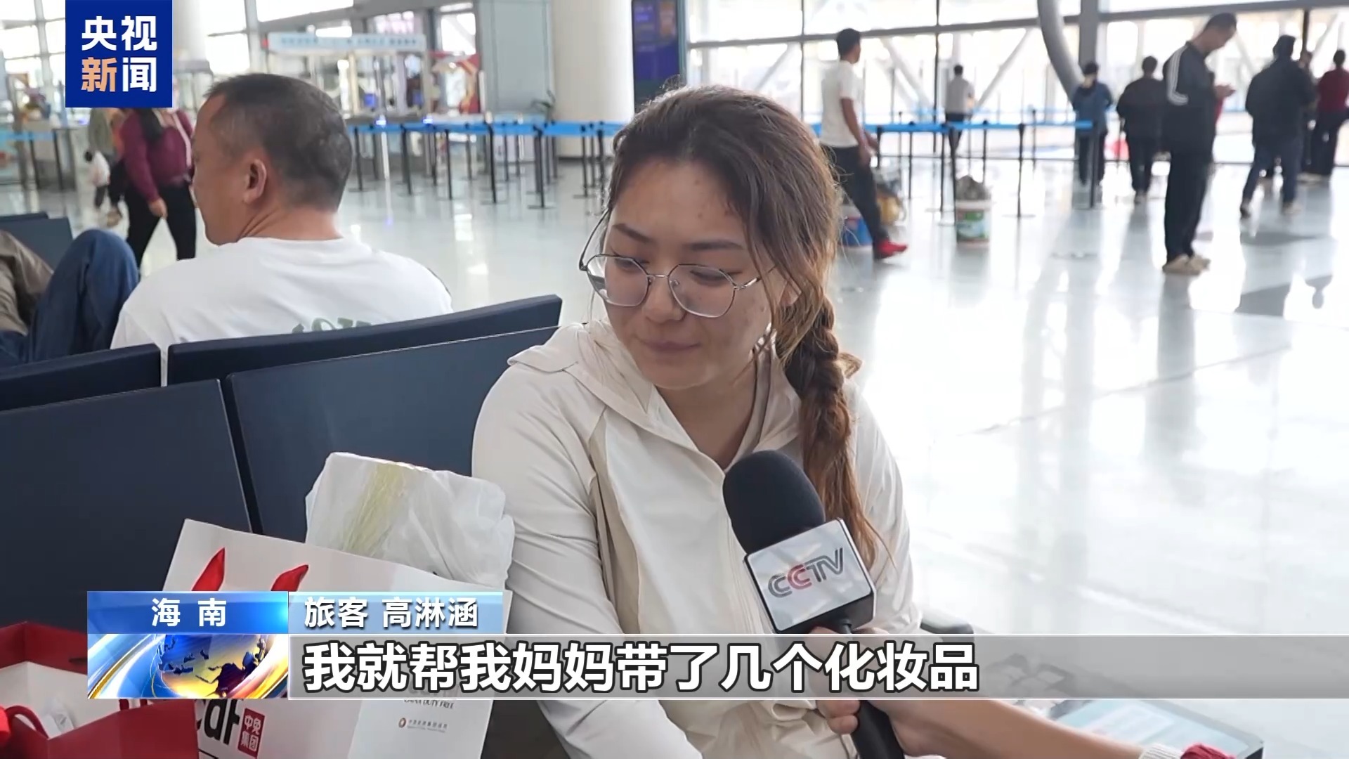 旅客 高淋涵:我就帮我妈妈带了几个化妆品,在海南买特别便宜。