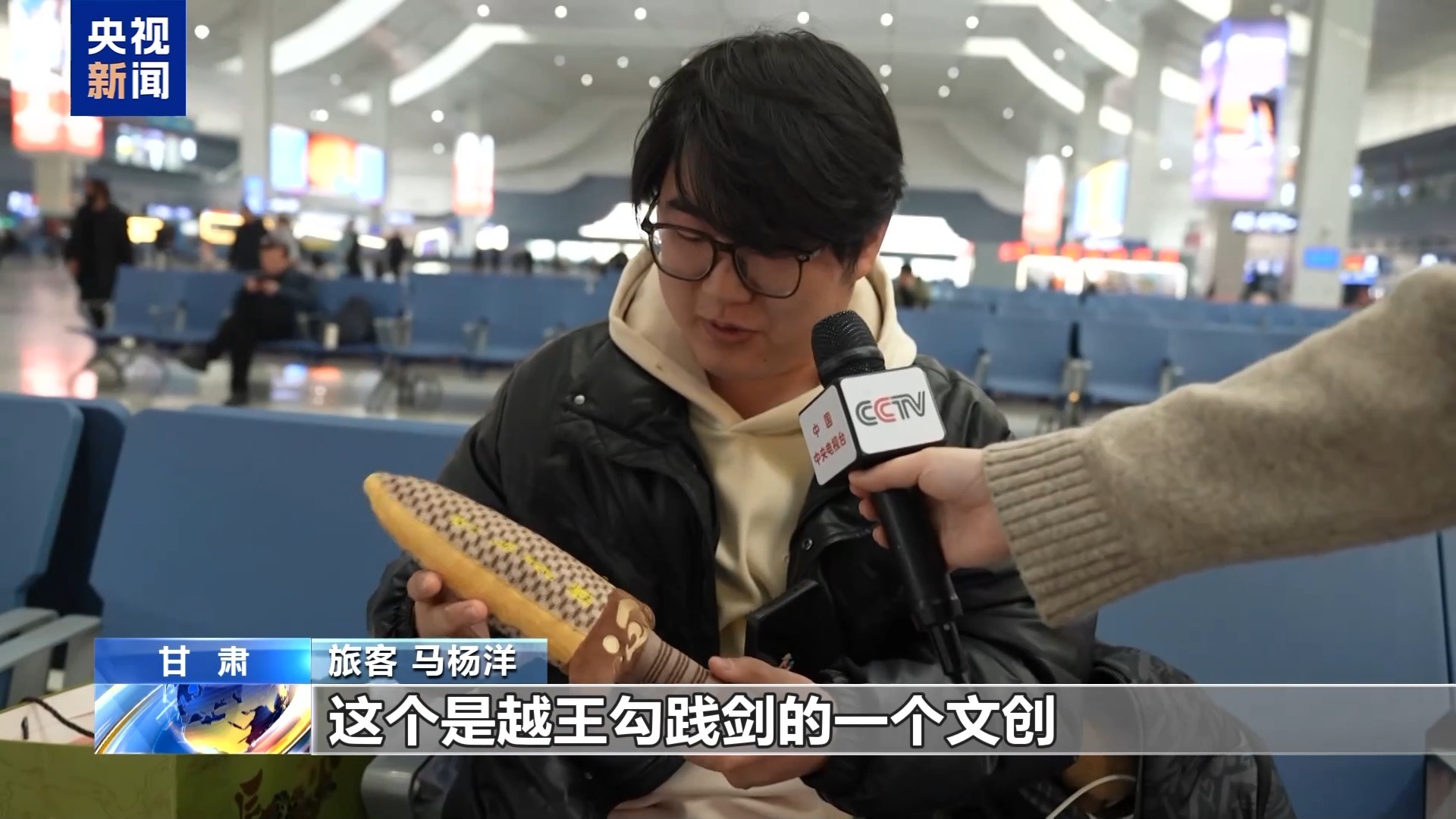 旅客 马杨洋:带了一些长沙那边的茶饼,咱们甘肃这边好像很少有,带给老人尝尝,这个是越王勾践剑的一个文创,它还会响。