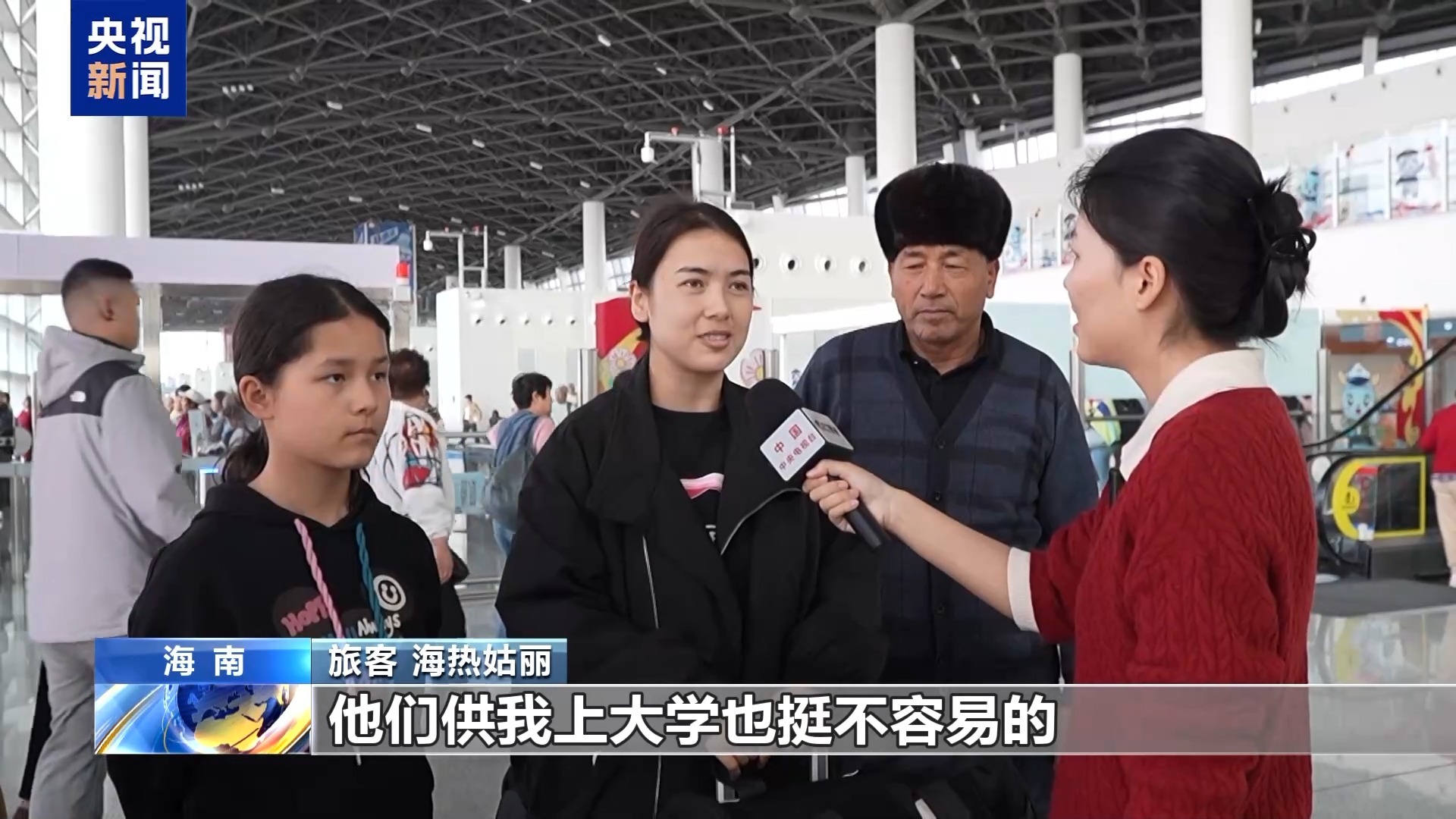 旅客 海热姑丽:以前都是我回新疆过年,家人供我读大学也挺不容易的,我现在已经上班了,我攒了一点钱带他们来海南旅游。