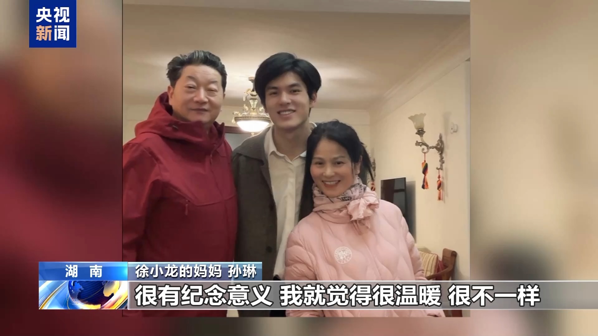 徐小龙的妈妈 孙琳:今年孩子给我带了他学校的纪念品,他现在还在复旦大学读研,回来就给我带了一件过冬的棉袄,有校标的,所以很开心。孩子送的肯定是不一样的,他能够有这份心带回来,很有纪念意义。我觉得很温暖、很不一样,我要等到过春节的时候穿。他在外读书应该有五年了,我觉得回来每次他回来,脸上是开心的笑容,我就很开心了。