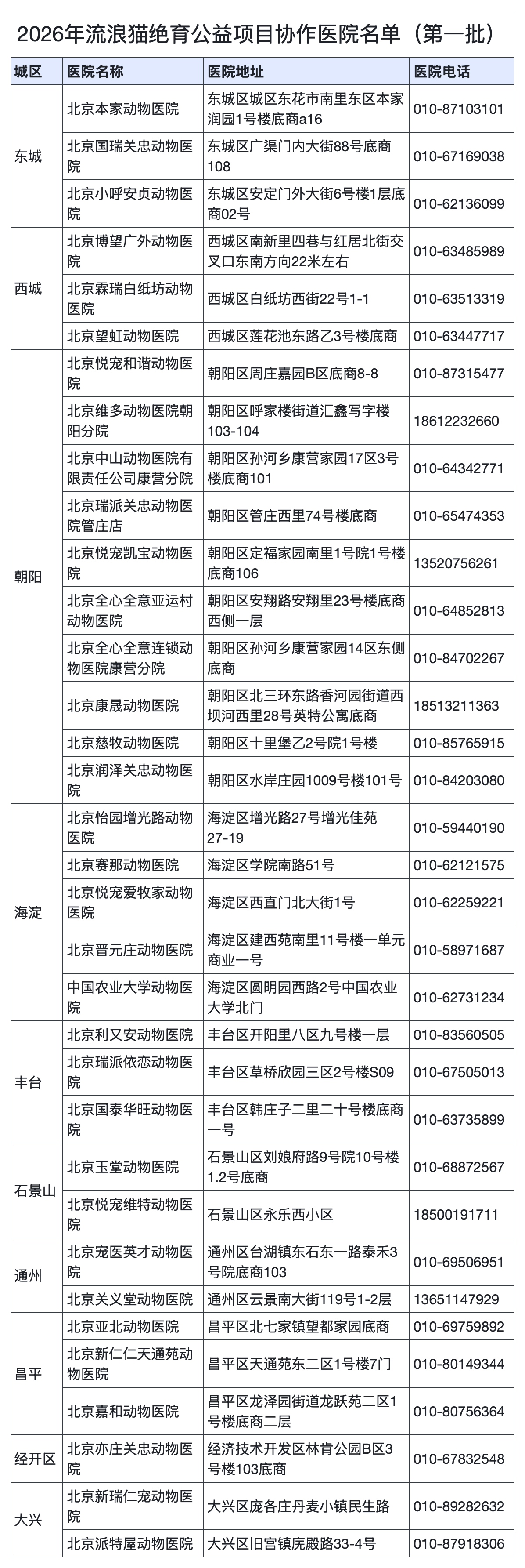 北京市10个区设立34家协作医院,为参与流浪猫救助的爱心人士与动物保护志愿者提供便捷、专业的流浪猫绝育服务,用实际行动守护城市里的每一个小生命。