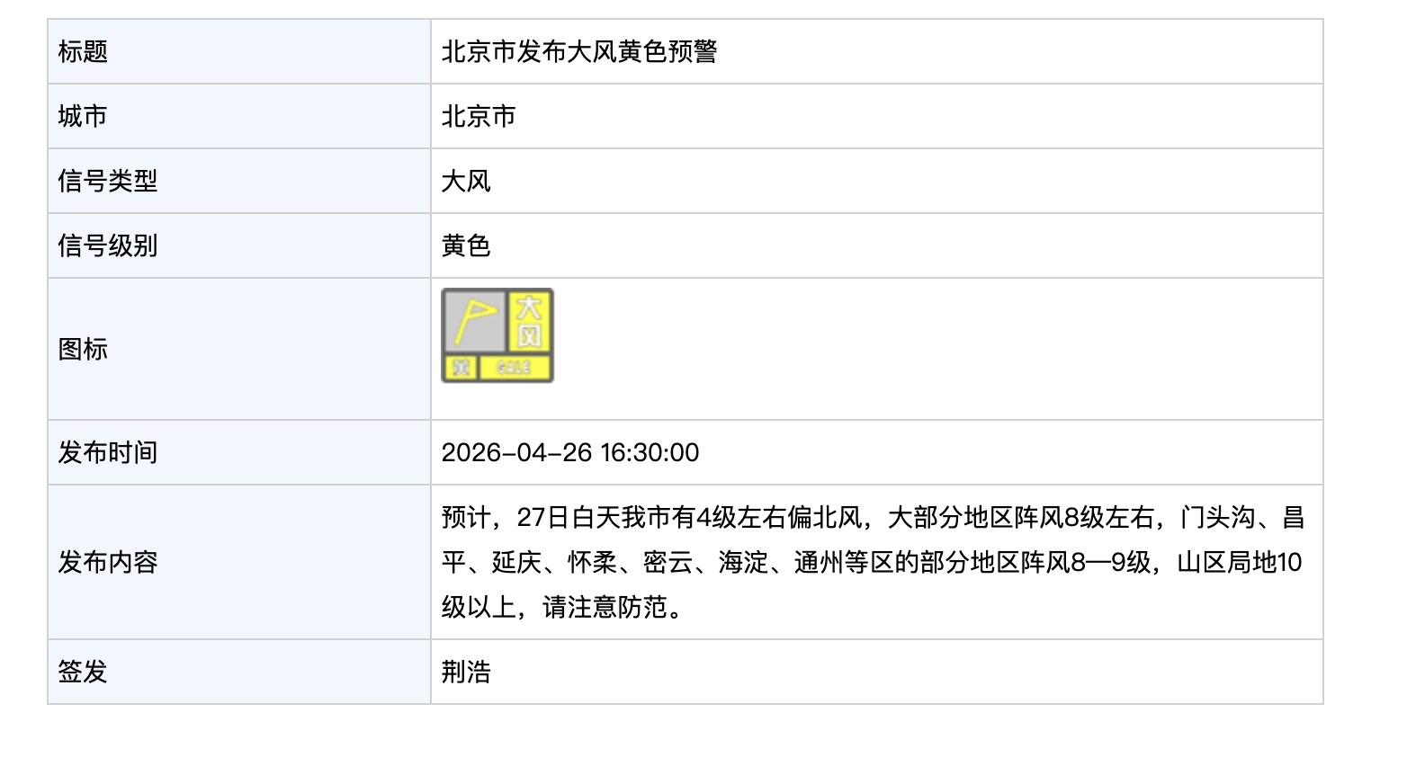 预计,27日白天我市有4级左右偏北风,大部分地区阵风8级左右,门头沟、昌平、延庆、怀柔、密云、海淀、通州等区的部分地区阵风8—9级,山区局地10级以上,请注意防范。