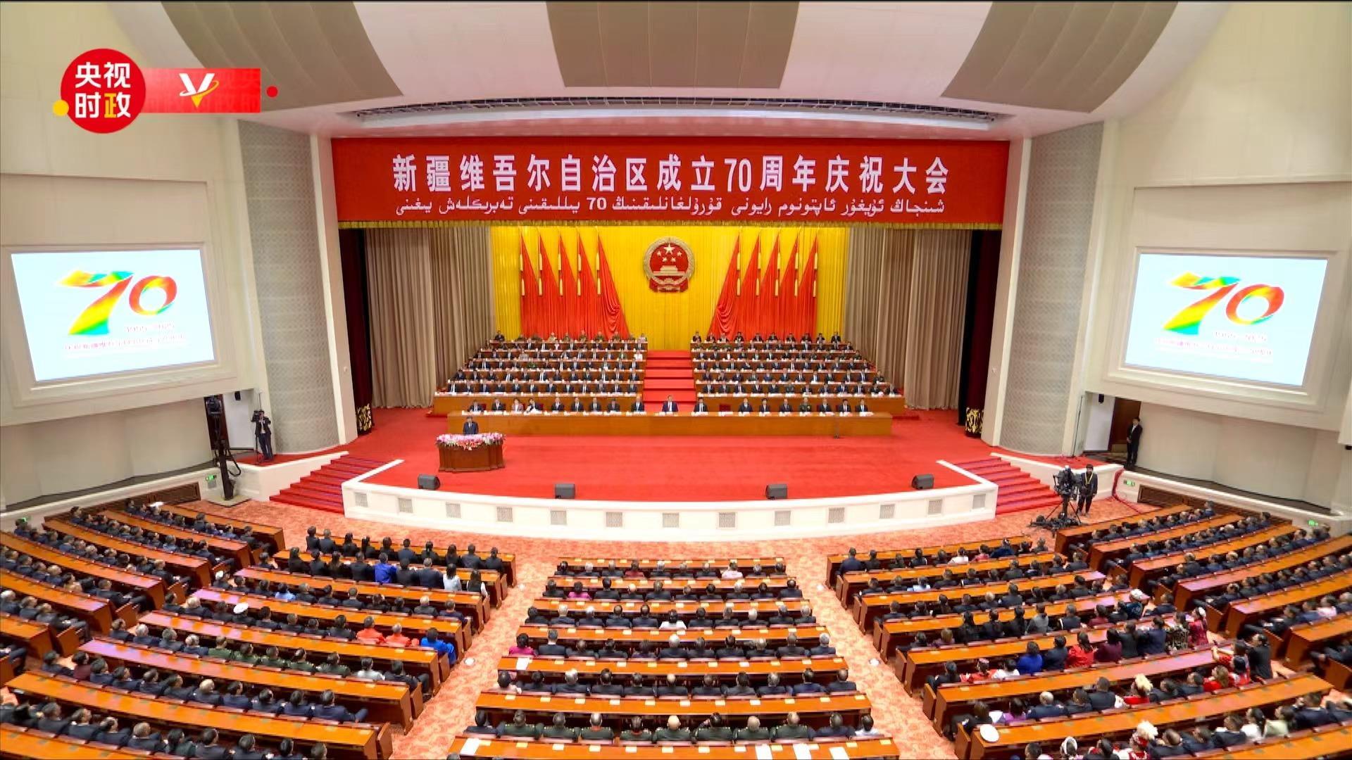 25日上午,新疆维吾尔自治区成立70周年庆祝大会在新疆人民会堂隆重举行。中共中央总书记、国家主席、中央军委主席习近平出席庆祝大会。