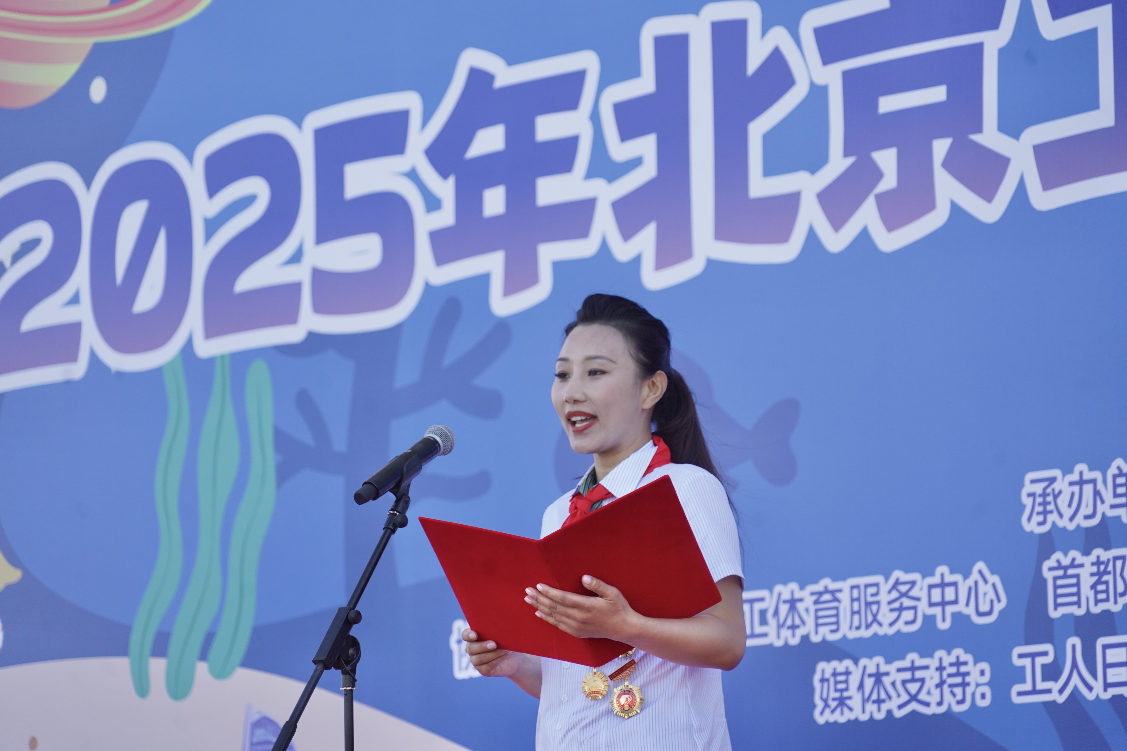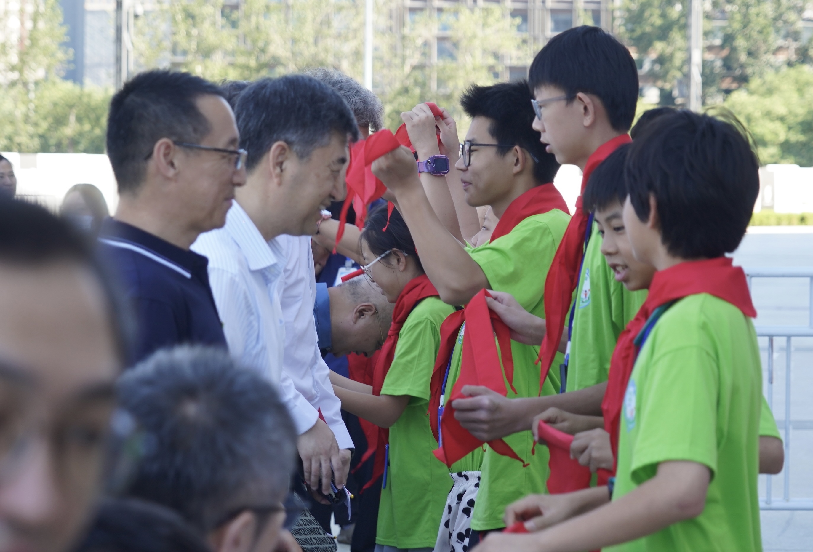 开营仪式在庄严的国歌声中拉开序幕,4名小营员代表高举国旗正步走上主席台,全场肃立致敬。随后,小营员代表为到场的领导嘉宾佩戴红领巾,鲜红的领巾在阳光下格外醒目,象征着劳模精神与少年梦想的接力传承。