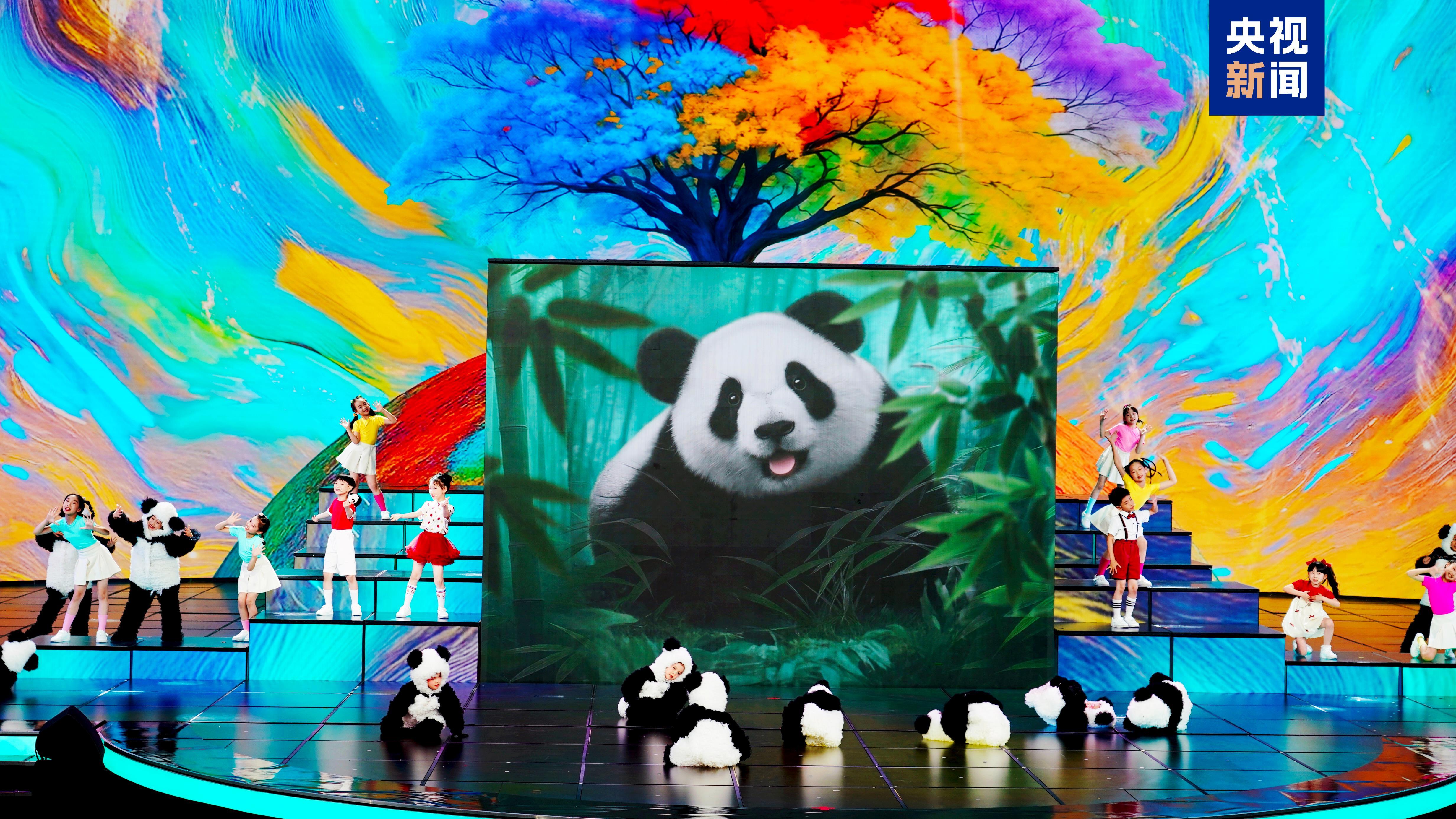 晚会同名主题曲《未来花正开》由来自北京、江苏、陕西、青海、河南、广东等省市及澳门特别行政区的多位少年儿童共同作词、AI作曲,呈现百花竞放的欢腾景象。《秒回童年》通过人工智能技术,请91岁表演艺术家陶玉玲、张勇手与童年时期的自己惊喜“同框”,展现时光流转中不变的艺术初心与传承力量。《抱抱地球》中立方体升降屏上生动呈现出一只“会唱歌的裸眼3D大熊猫”,它与小朋友共唱自然之歌,传递对地球的关爱。