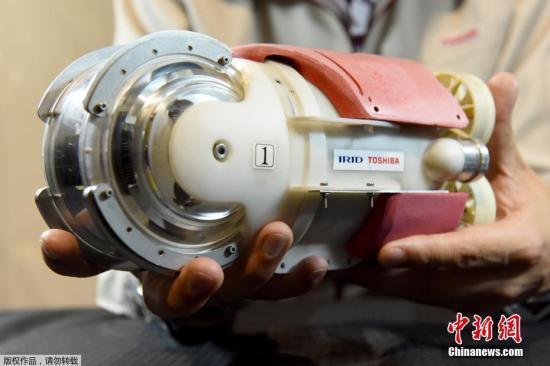 当地时间2017年6月15日,日本神奈川县横须贺市,由东芝与“国际反应堆报废研究开发机构”(IRID)共同开发的新机器人公开亮相。这个长30厘米、直径13厘米的水下机器人将被投放到福岛第一核电站3号机组的反应堆安全壳内底部展开调查。该机器人配有前后置摄像头以及LED灯光,将于今夏投入使用。