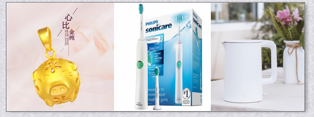 活动奖品:金猪吊坠(足金,飞利浦电动牙刷,小米不锈钢自动断电保温烧水壶,订制爆款鼠标垫,神秘爆款猪猪抱枕。