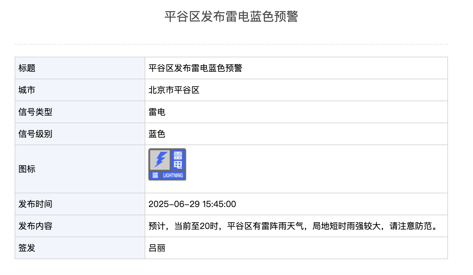 截至目前,北京市房山区、通州区、平谷区发布雷电蓝色预警。
