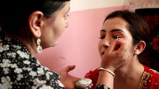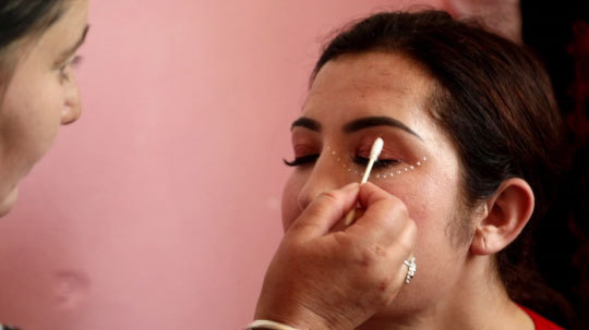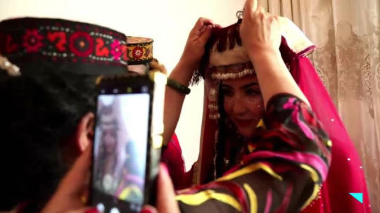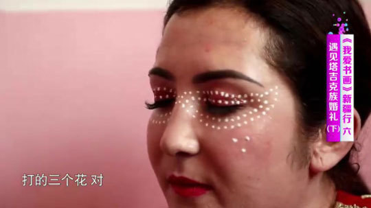 史老师在新娘的二嫂苏拉带领下进到新娘的闺房,此时新娘正在化妆,塔吉克族婚礼妆容很有特色,她们的眼睛周围要点白点,白点是由珍珠粉磨制的,而化妆师必须要精挑细选,一是心灵手巧会化妆,二是这位化妆师得是幸福之人,这样才能更好地把祝福送给新娘。新娘的眼睛周围化妆出来的图案像是展翅高飞的雄鹰。