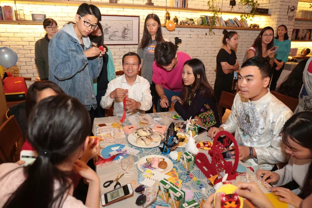 图:段维孟(右二)在学校举办的国际文化节上学习制作中国手工艺品