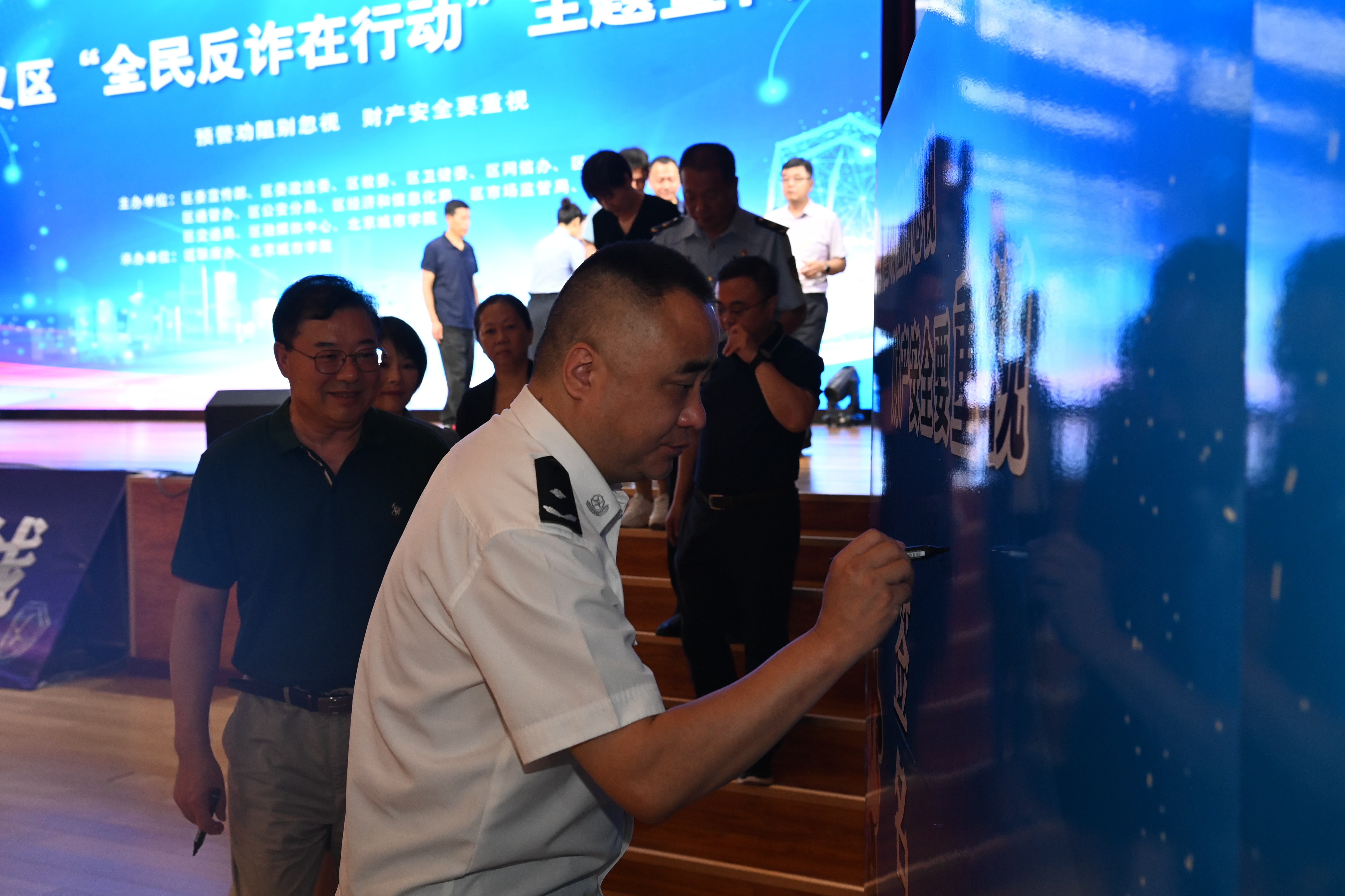 本次活动由顺义区打击治理电信网络新型违法犯罪联席会议办公室与区委宣传部、杨镇镇政府和北京城市学院联合举办。在北京城市学院潮白礼堂的活动现场,全体与会人员统一观看了电信网络诈骗十大高发类案介绍和顺义区反诈宣传短剧《破诈》。随后,顺义区副区长、公安分局党委书记、局长杨大胜为区级专业反诈宣传队和9家专业反诈宣传分队进行授旗并发布了全民反诈动员令。最后,与会人员依次在签名板上签字留言以示反诈防诈的决心,共同为反诈行动凝聚起强大的力量。