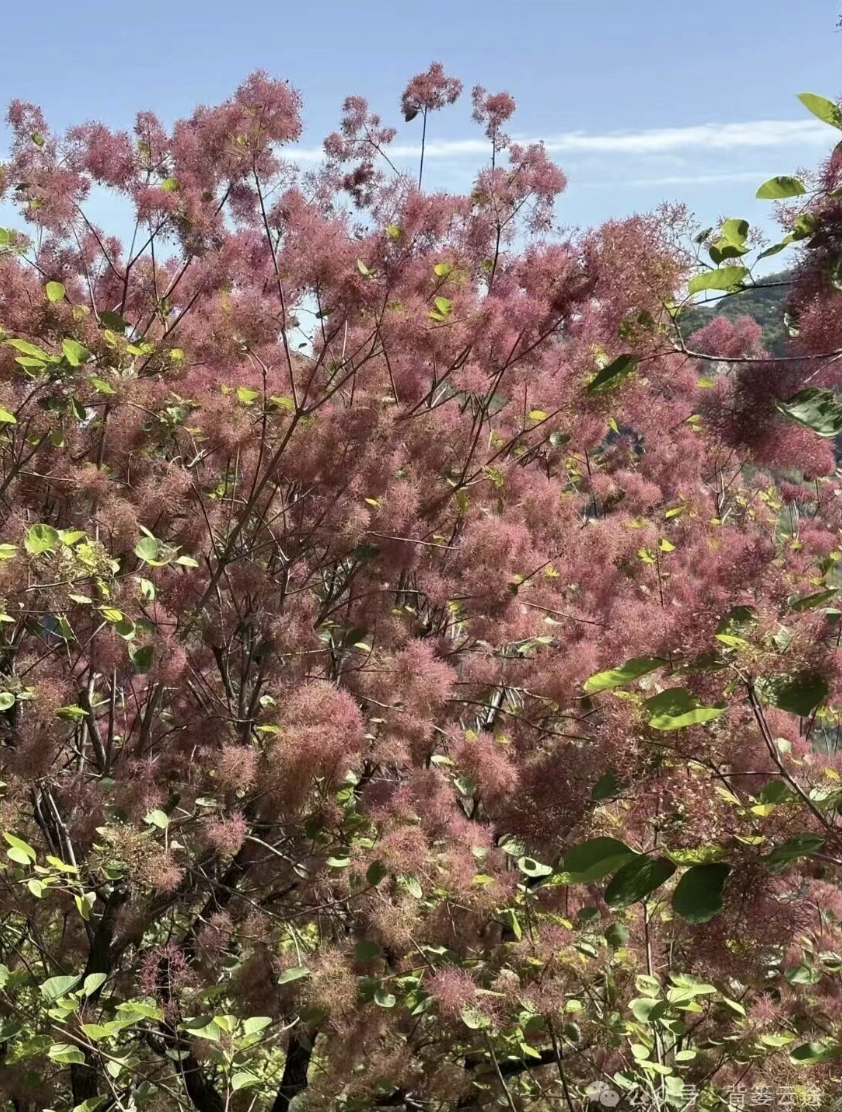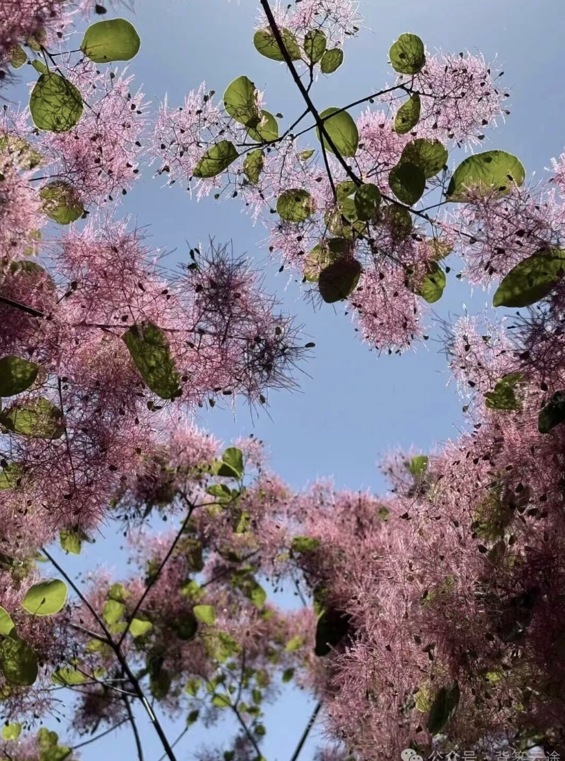图4-5:四月下旬的房山区幽岚山坡峰岭,黄栌花已开成一片粉紫色的海洋。漫步花海核心步道,打卡百年黄栌古树与花海同框;登上半山观景台俯瞰整片花海全景,视野拉满。来坡峰岭赴一场黄栌花之约,把春天的温柔与浪漫装进镜头里吧。