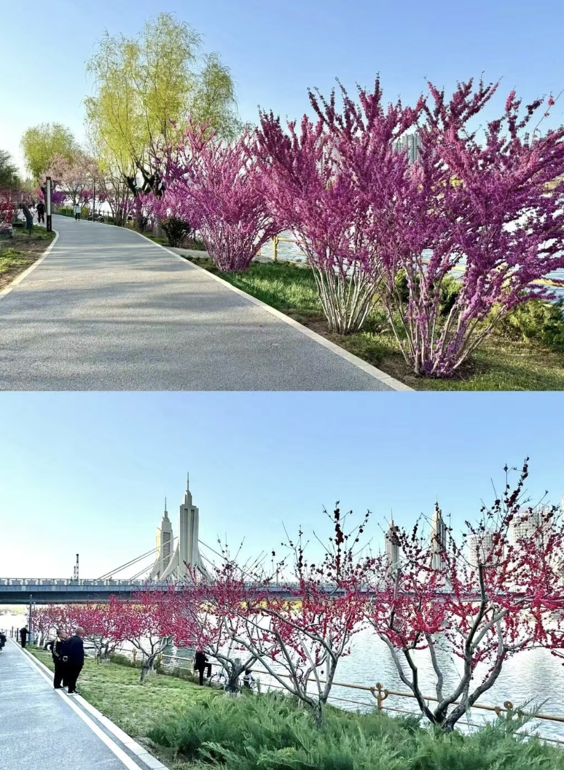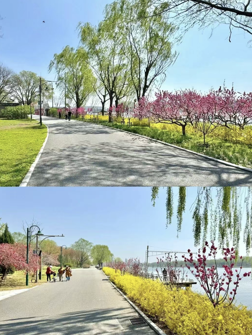 图10-11:春日的大运河森林公园风景正好,碧水悠悠 ,两岸花堤蜿蜒,粉红的桃花沿着步道一路铺开,踏青赏花、带娃遛弯、休闲骑行,这里都特别合适~