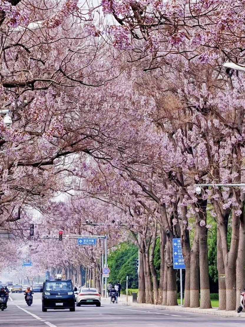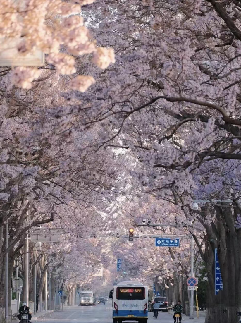 图1-3:四月的风拂过北京亦庄的街角,宏达北路两侧的泡桐树便如约苏醒。进入盛花期的泡桐树开满了淡紫色的花,在道路上方交织成一条天然的“花之隧道”。微风吹过,花瓣轻轻飘落,仿佛下起了一场浪漫的紫色花雨。最浪漫的莫过于搭乘亦庄线地铁欣赏泡桐花海,见证“开往春天的列车”的绝美画面。