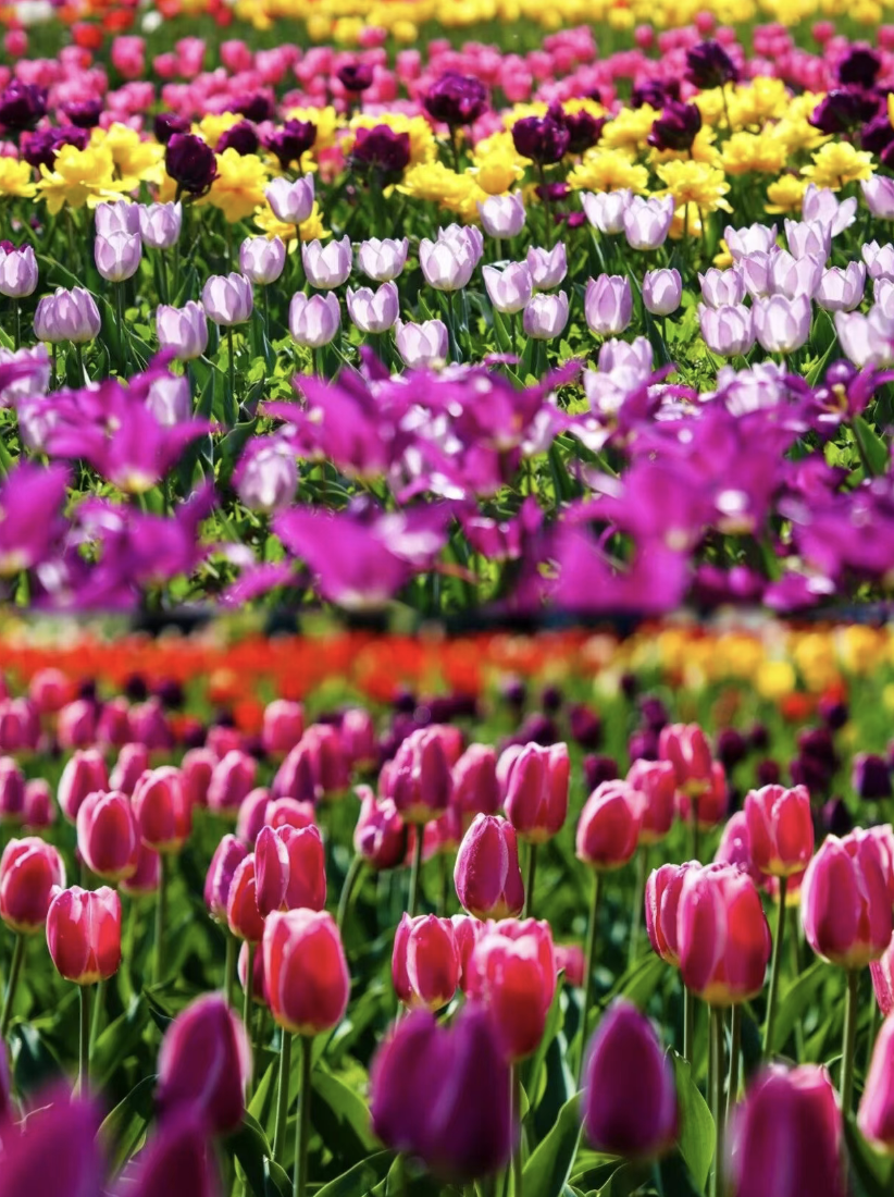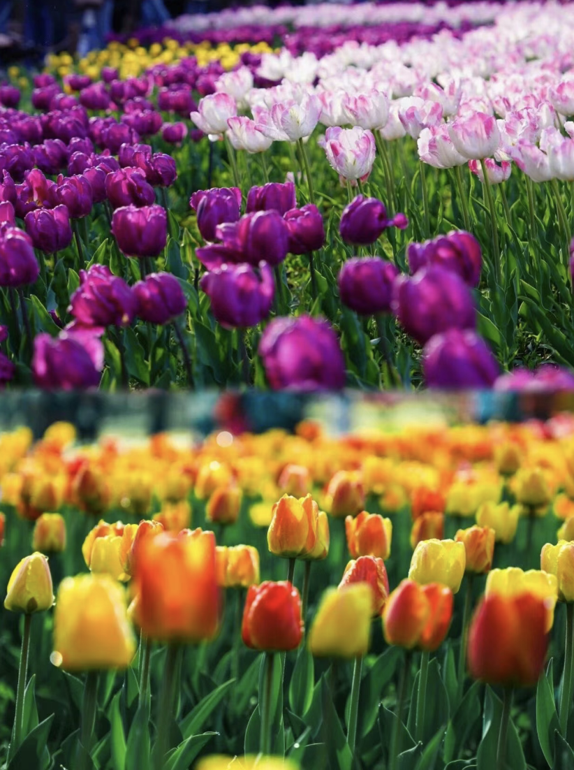 图6-7:国家植物园的郁金香花海最佳观赏期已至~各式郁金香展露芳颜、迎风摇曳,如绚丽锦缎装点大地。近赏郁金香娇美、碧桃多姿,远眺山色清朗,俯仰之间皆是春意,目之所及尽数繁花,独享植物园带来的诗情画意。