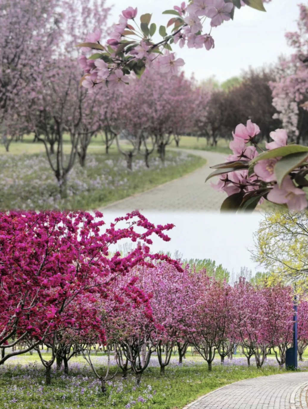 图12:位于通州区的东郊森林公园藏着一处春日海棠秘境。这里以万亩林海为幕,6000平方米的海棠次第铺展,粉白缀枝、落英铺径,搭配二月兰的紫韵与金叶榆的鎏金,将春日盛景揉碎在林间,随手一拍皆是森系大片。