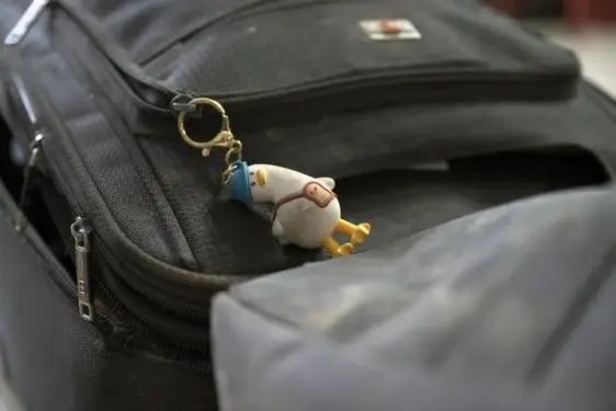 在杨勇的出乘拉杆箱上,还挂着一只可爱的歪头鸭挂件。或许承载着他淳朴的童心,抑或寄托着对孩子深切的牵挂。