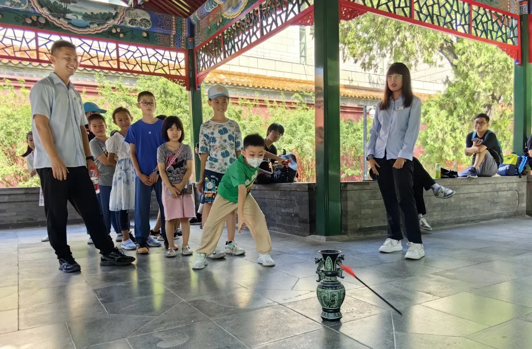 讲解投壶游戏历史文化内涵。介绍中山公园投壶亭,投壶游戏玩法。在投壶亭内组织学生体验投壶游戏。