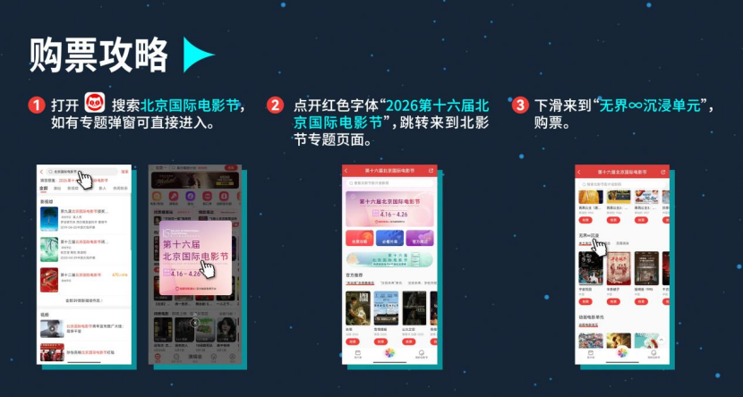 展映已在猫眼平台开售,观众可通过美团猫眼“北京国际电影节专题”直接购票,具体方式详见下图。